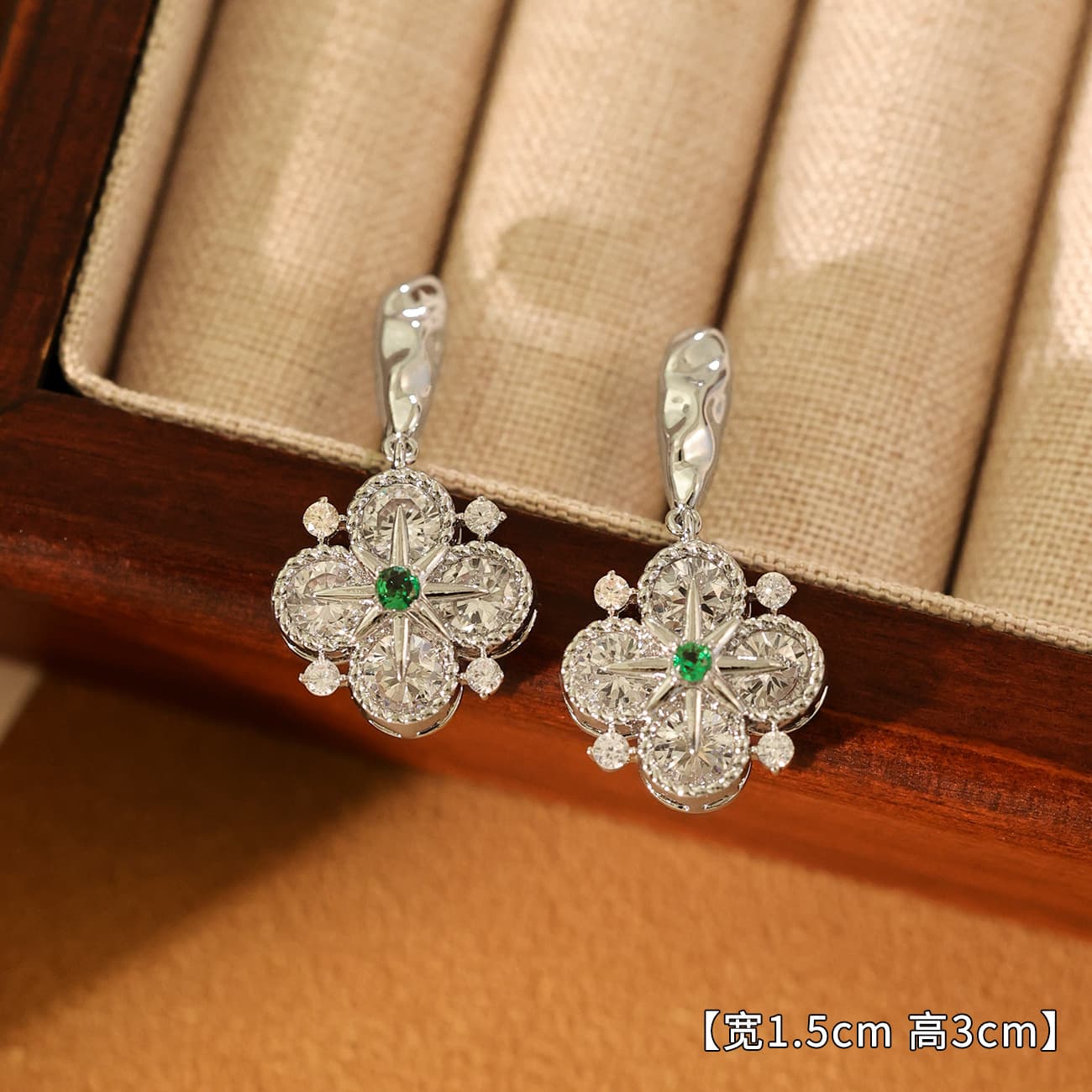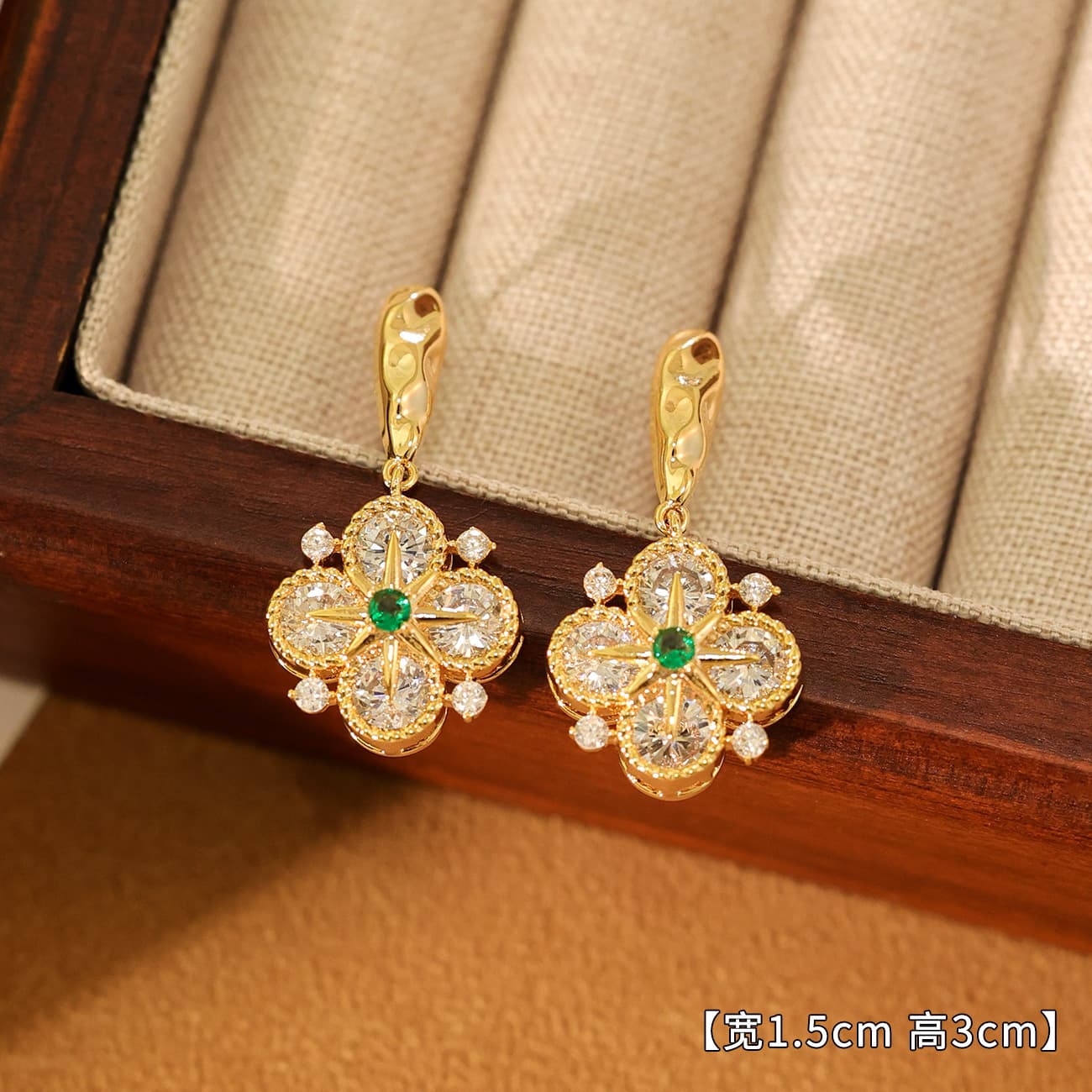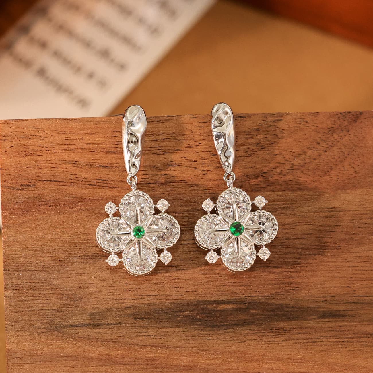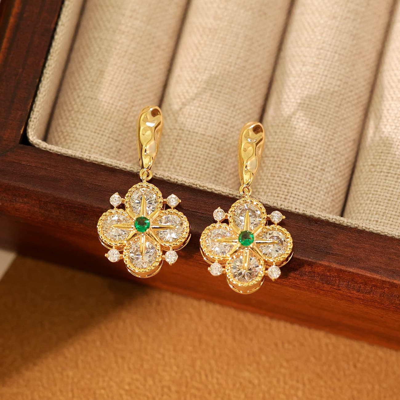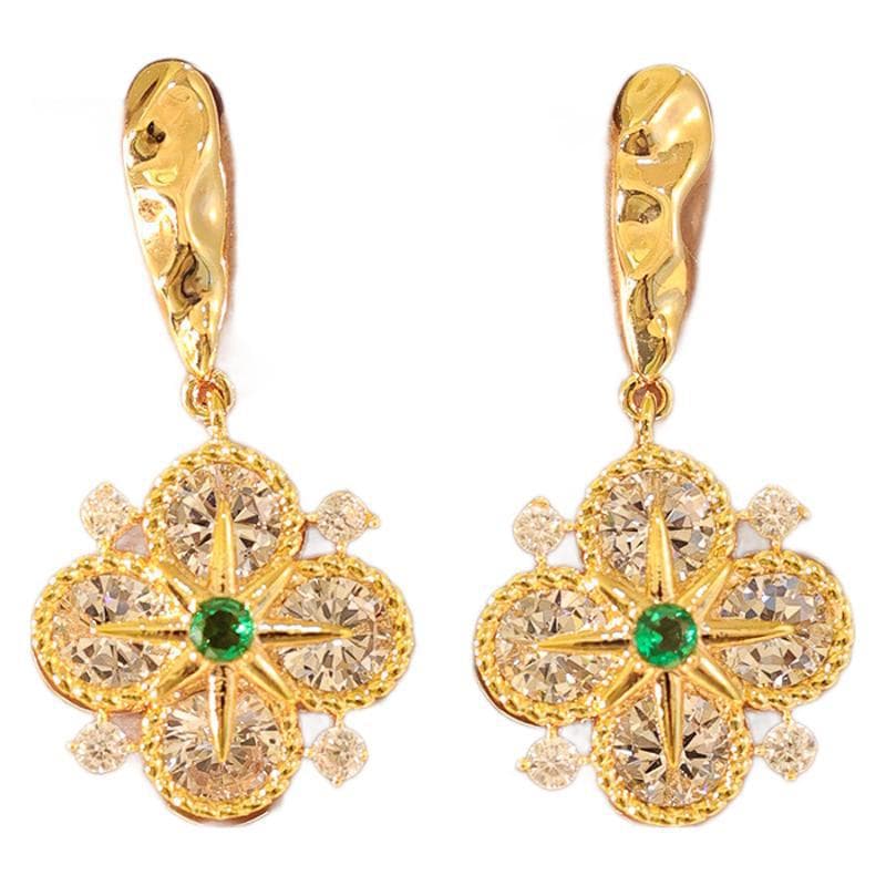 Gold Plated Green Zircon Four-Leaf Flower Drop Earrings