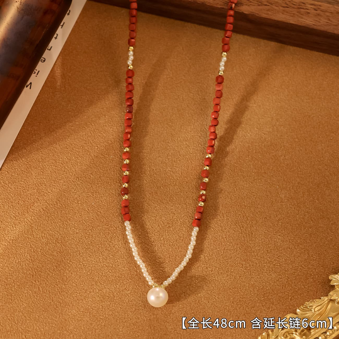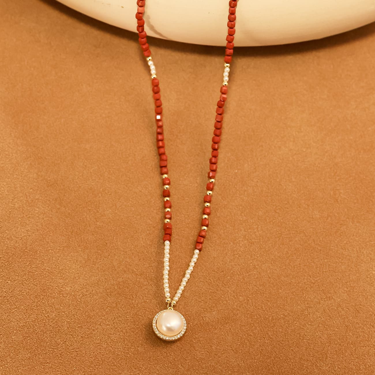 Introduce your customers to the exquisite Natural Freshwater Pearl Red Cut Stone Beaded Necklace, a captivating piece that beautifully blends classic elegance