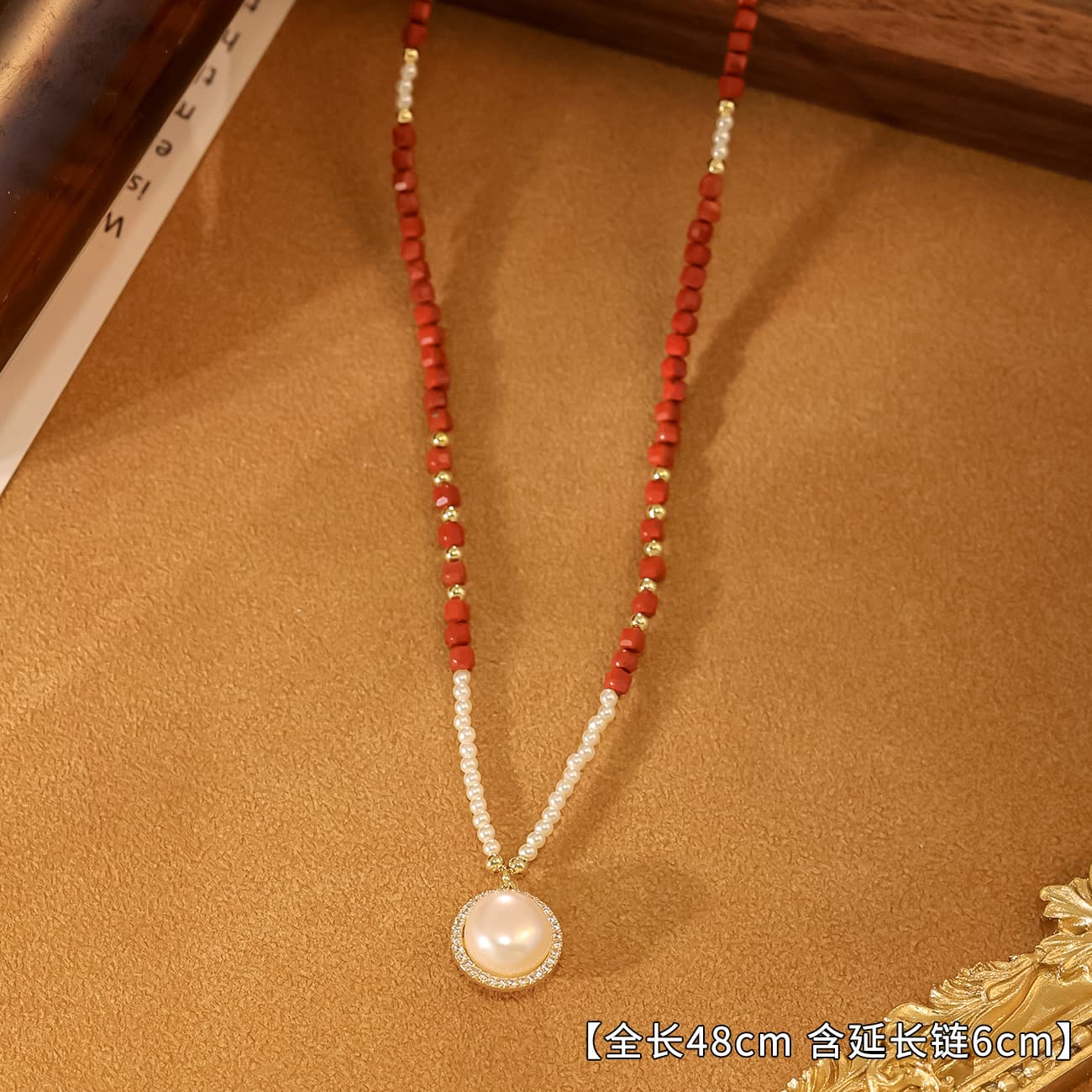 Natural Freshwater Pearl Red Cut Stone Beaded Necklace