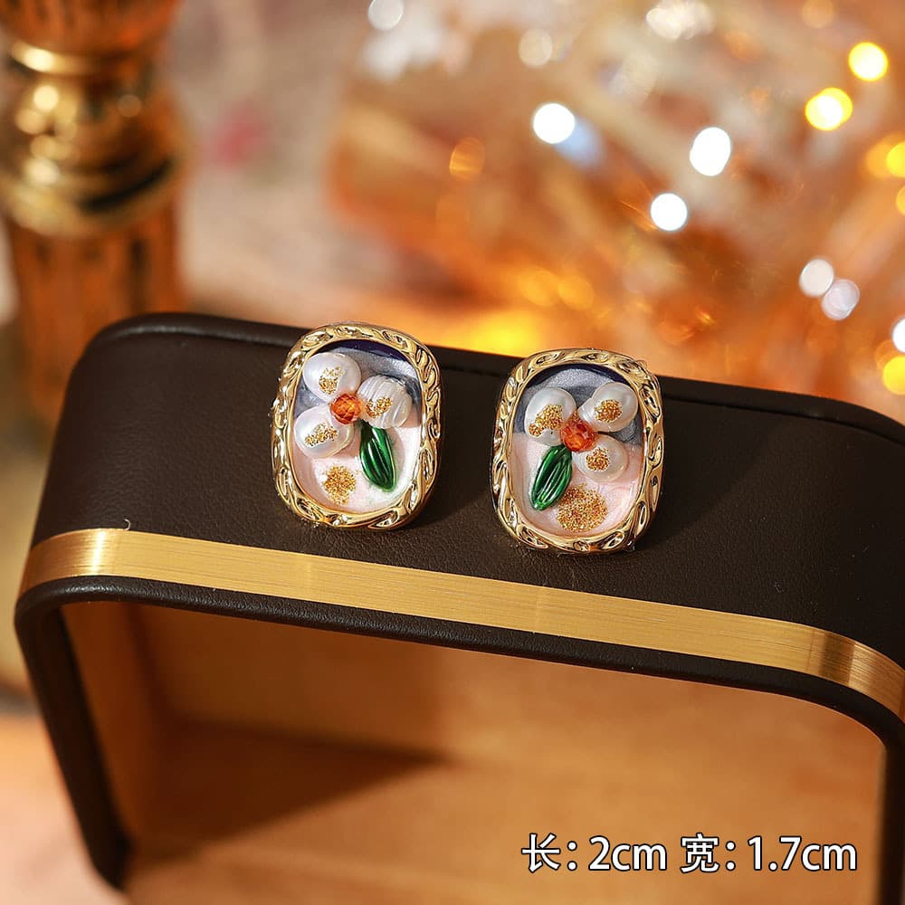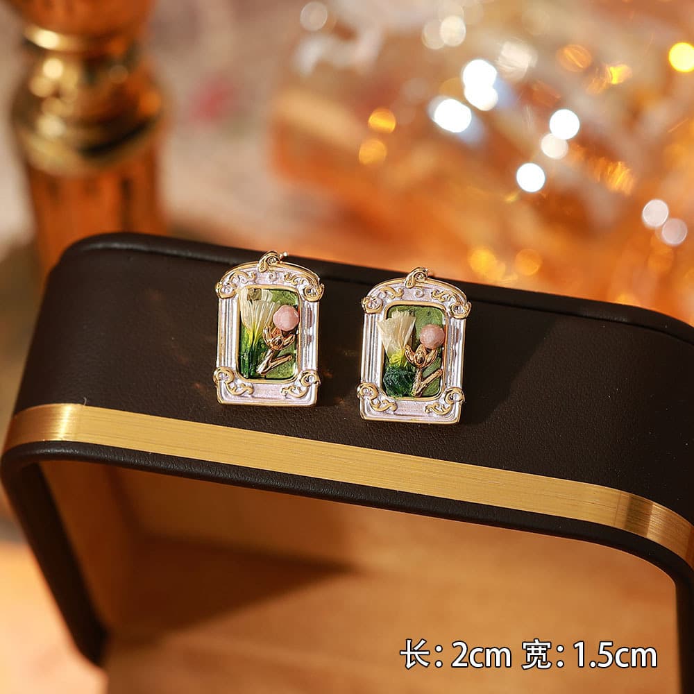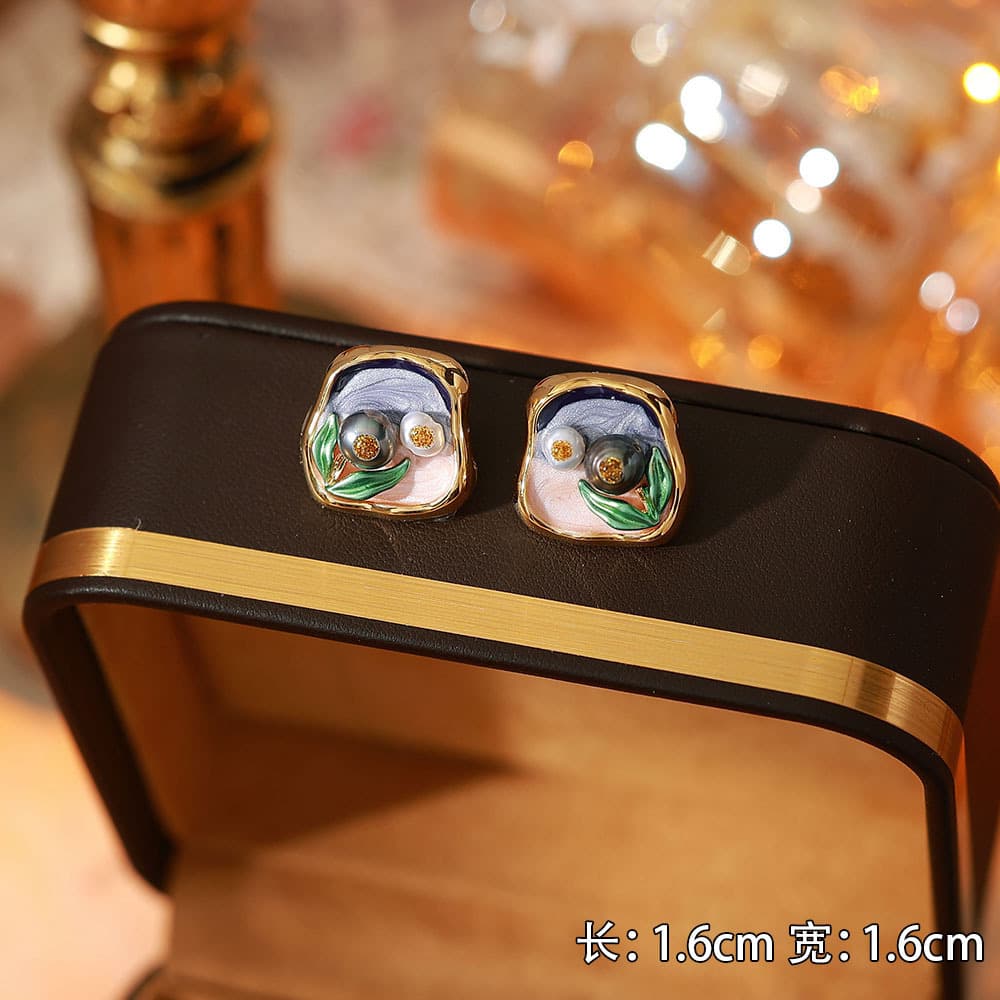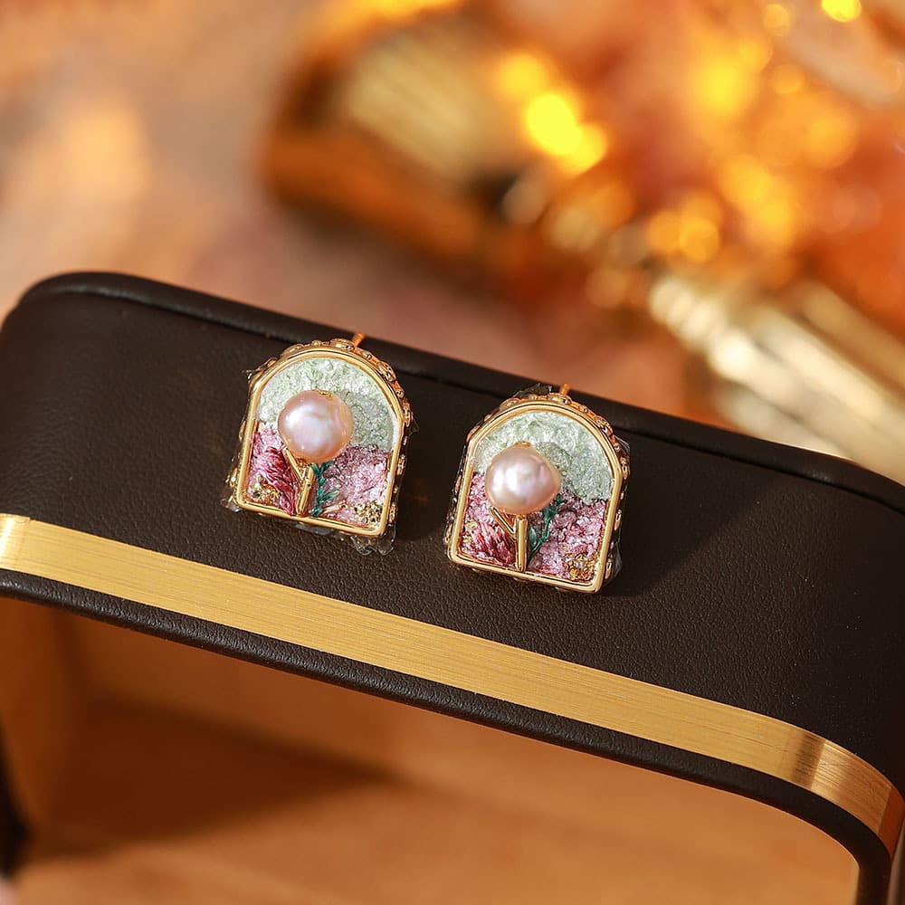 Monet Garden Oil Painting Enamel Pearl Stud Earrings
