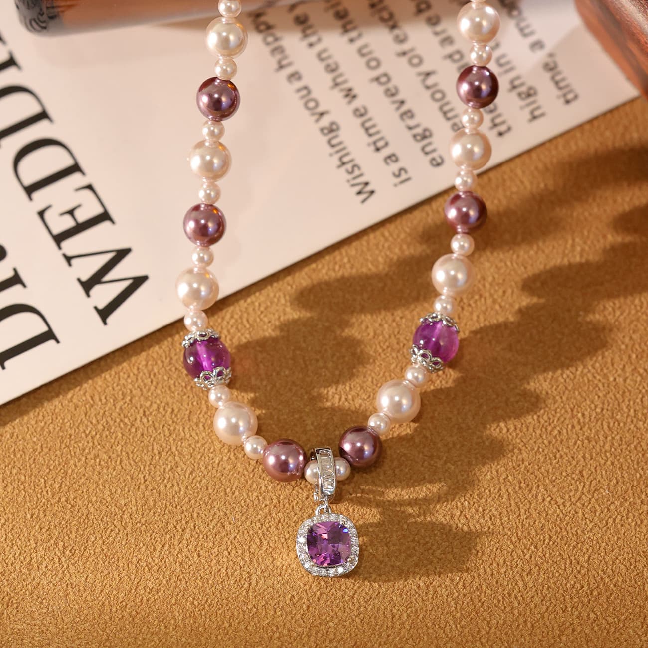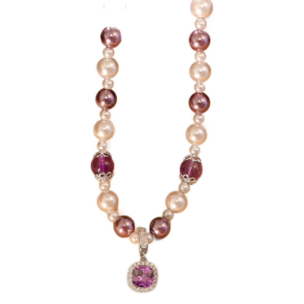Amethyst Cube Pearl Necklace with Rhinestone Pendant