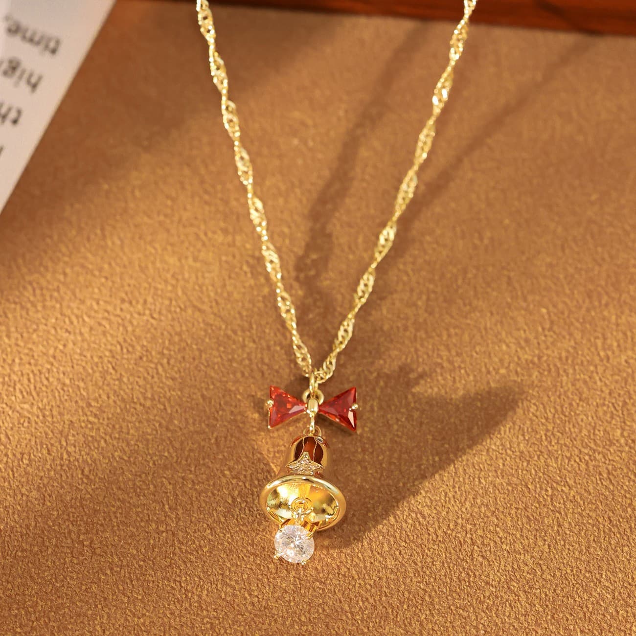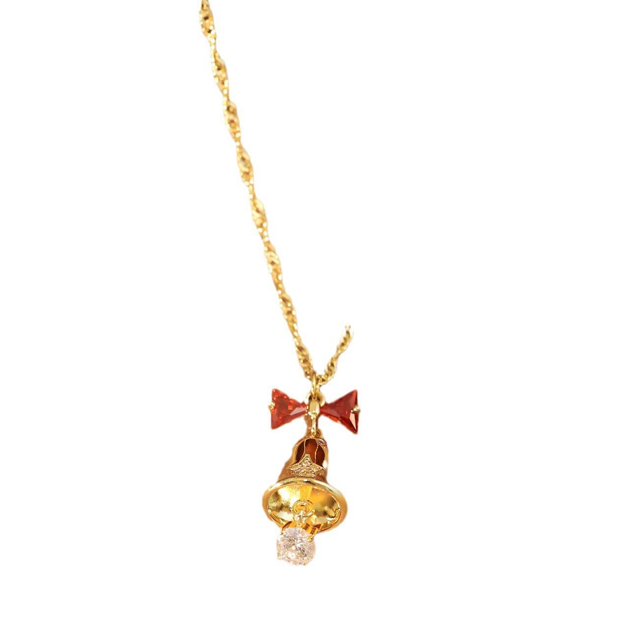 Gold Christmas Bell Zircon Bow Pendant Necklace