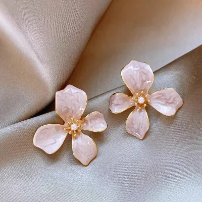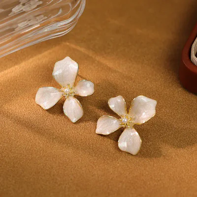At the core of these stunning earrings is a high-quality copper base, chosen for its durability and excellent properties for fine jewelry making. The copper is expertly treated with a premium electroplating process, which ensures a brilliant, long-lasting finish that resists tarnishing and wear. The centerpiece of the design is the intricate floral motif, created using a specialized oil painting or enamel technique. This method allows for vibrant, layered colors (available in soft pink, classic white, and elegant purple) that mimic the delicate translucence of painted art. Each earring is completed with a lustrous, high-grade pearl, adding a touch of classic sophistication to the artistic design.