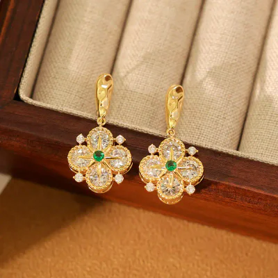 Premium Gold Plated Green Zircon Four-Leaf Flower Drop Earrings