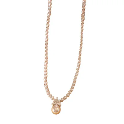 Quality is paramount in the construction of this necklace. The foundation is a durable base metal alloy, chosen for its strength and ability to hold fine details. This base is then treated with a high-quality electroplating process, resulting in a rich and lasting rose-gold finish that resists tarnishing. The key features are the pearls, selected for their uniform roundness and strong, reflective luster, giving them the appearance of genuine high-grade pearls. The pendant's charm is enhanced by a meticulous mixed-gemstone setting, where each stone is precisely placed to create a harmonious and eye-catching display of subtle sparkle.
