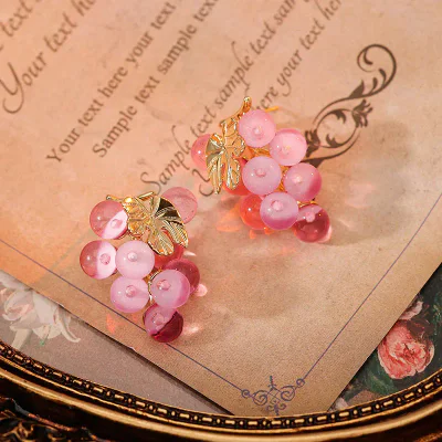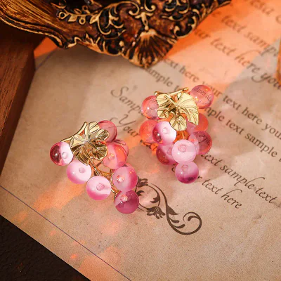 Each pair of these grape earrings is a testament to skilled, manual craftsmanship. The focal point is the cluster of high-quality purple crystals, precision-cut to maximize their brilliance and light-reflecting properties. These crystals are carefully arranged and secured by hand to create a three-dimensional, lifelike grape bunch. The metalwork is available in two styles to cater to different customer preferences: