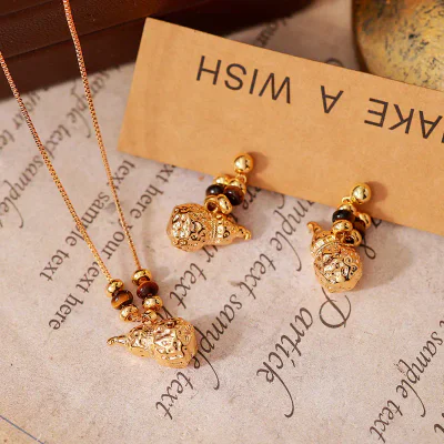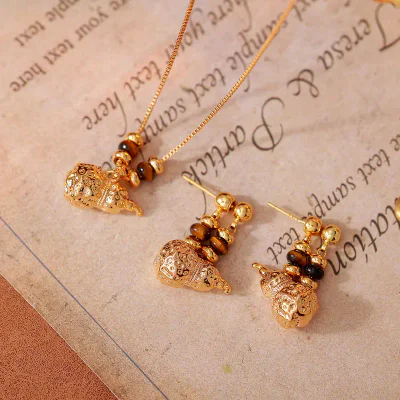 Quality is paramount in this jewelry set. The base material is high-grade copper, chosen for its durability and ability to hold fine details. The pieces undergo a genuine gold electroplating process, which imparts a rich, warm luster and provides superior resistance to tarnishing compared to standard fashion jewelry finishes. Every component, from the gourd charms to the clasps and earring backs, is meticulously crafted and polished to ensure a flawless, high-quality feel. This commitment to superior craftsmanship ensures customer satisfaction and repeat business for our wholesale partners.
