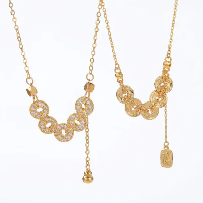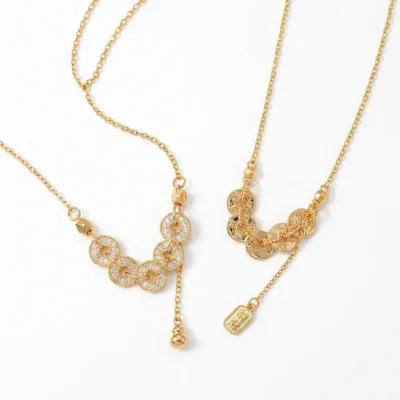 This necklace is crafted with a focus on quality and longevity, essential for the B2B market. The core of the pendant and chain is a durable, high-quality copper base, ensuring a solid feel and structural integrity. This base is then expertly treated with a multi-layer electroplating process, finished with a thick, genuine 18K gold coating. This premium plating technique provides a rich, luxurious color that mimics solid gold, while also offering excellent tarnish resistance and durability for long-lasting wear. The fine chain is lightweight yet strong, and the entire piece is polished to a high shine, accentuating the intricate details of the coin design. Each necklace is meticulously inspected to meet high standards, ensuring a consistent, high-quality product for your inventory.