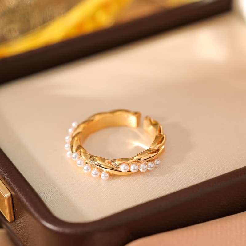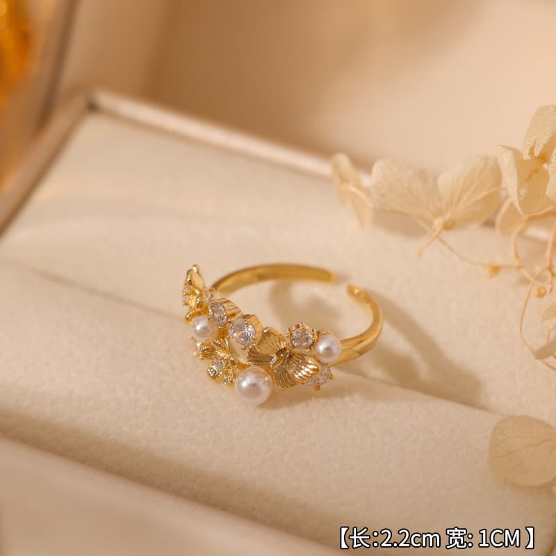 Gold Plated Geometric Zircon Pearl Adjustable Ring