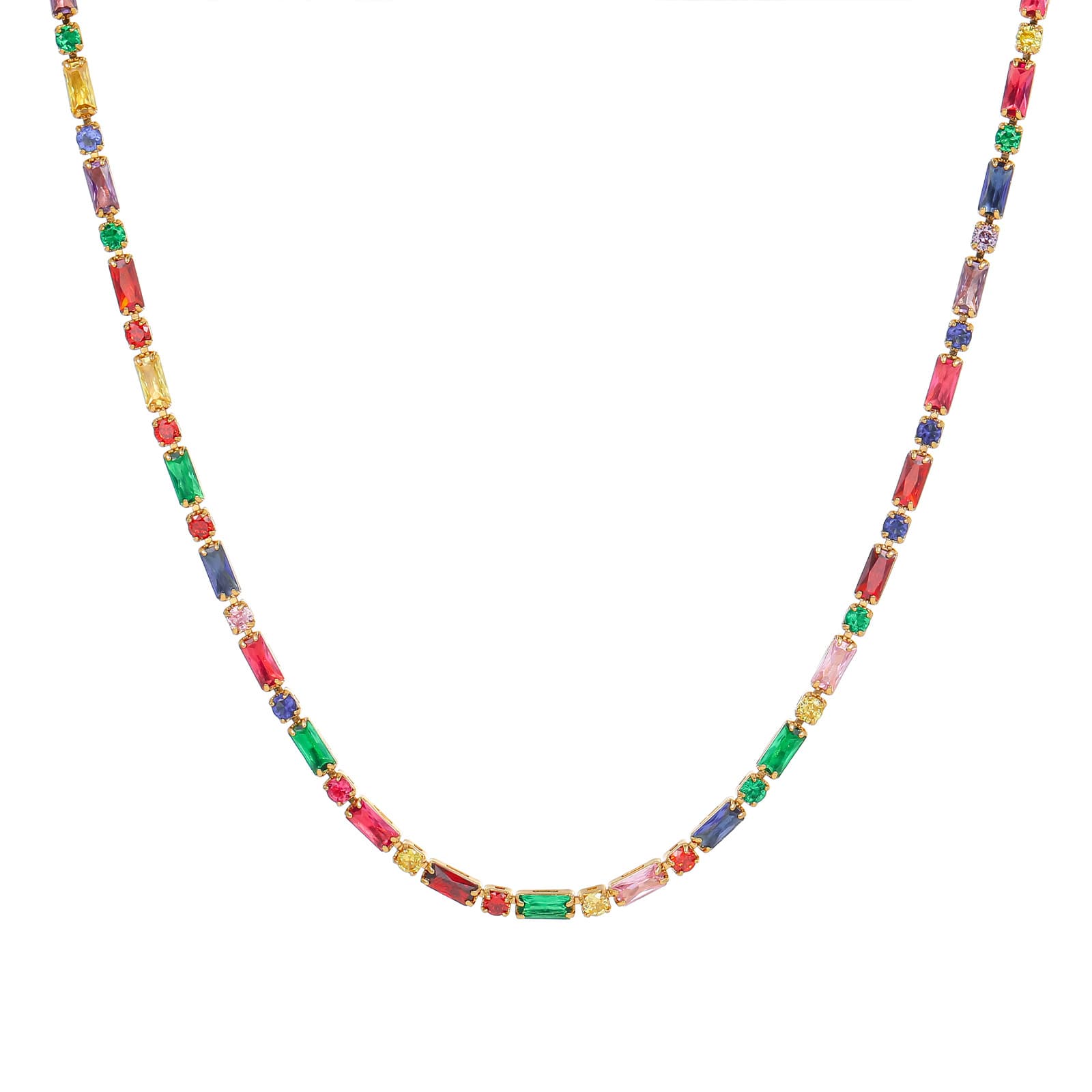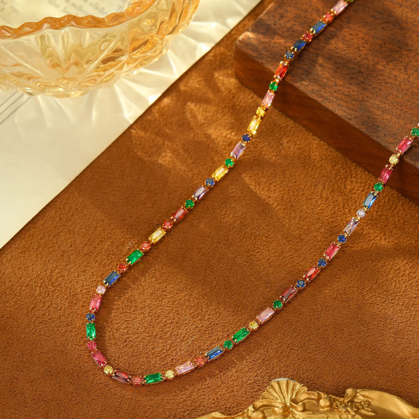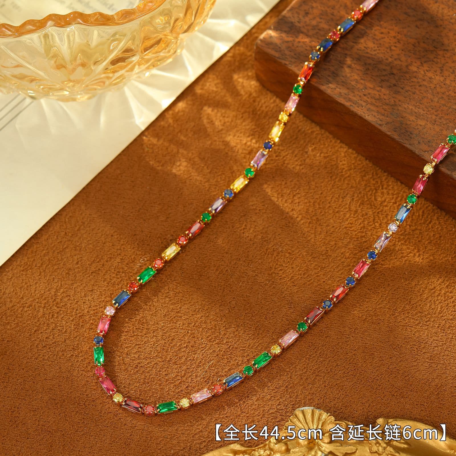 Introduce your customers to the vibrant "Copper Colorful Zircon Geometric Necklace Bracelet Set," a captivating collection designed to add a